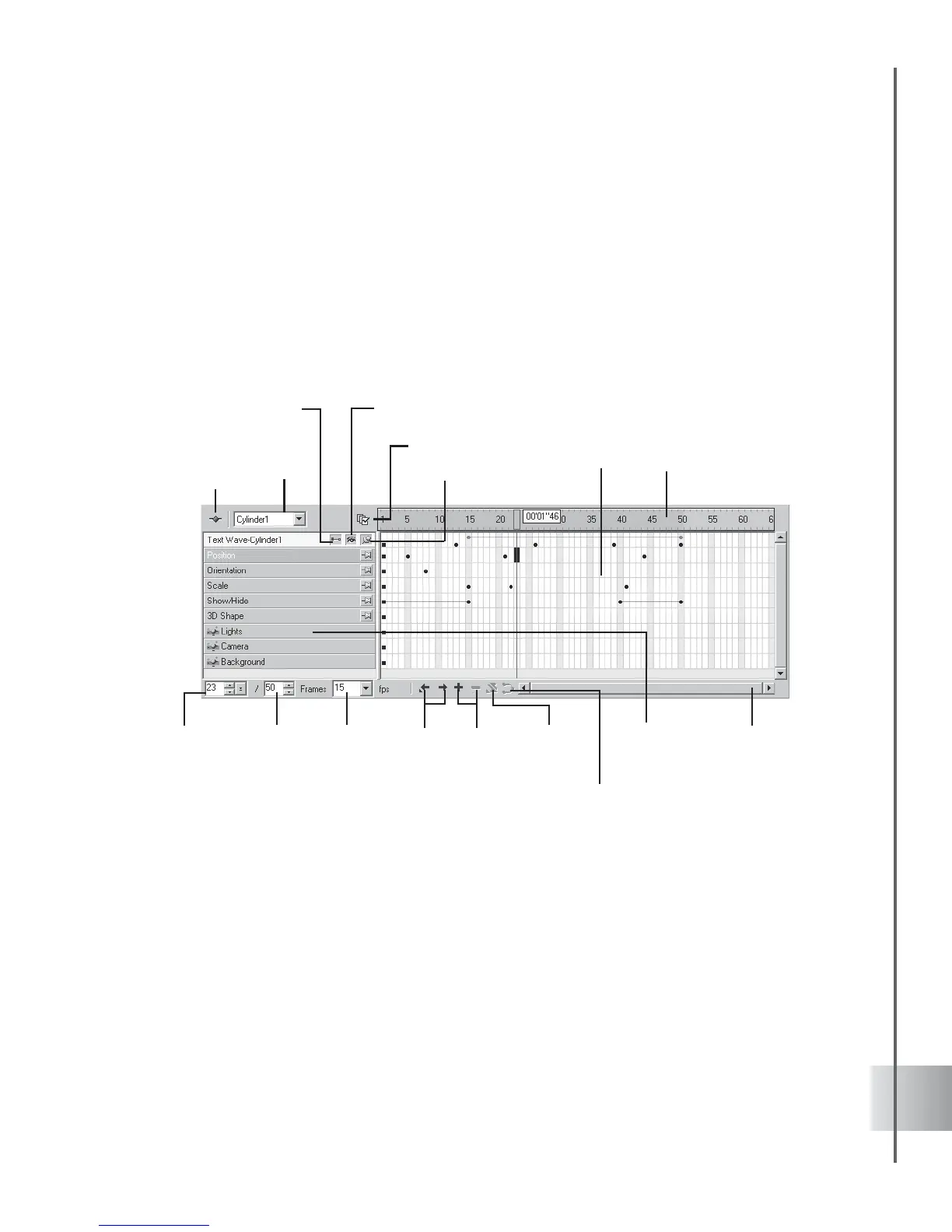 given key frame determines the object’s state at that frame. Brief descriptions of the Timeline