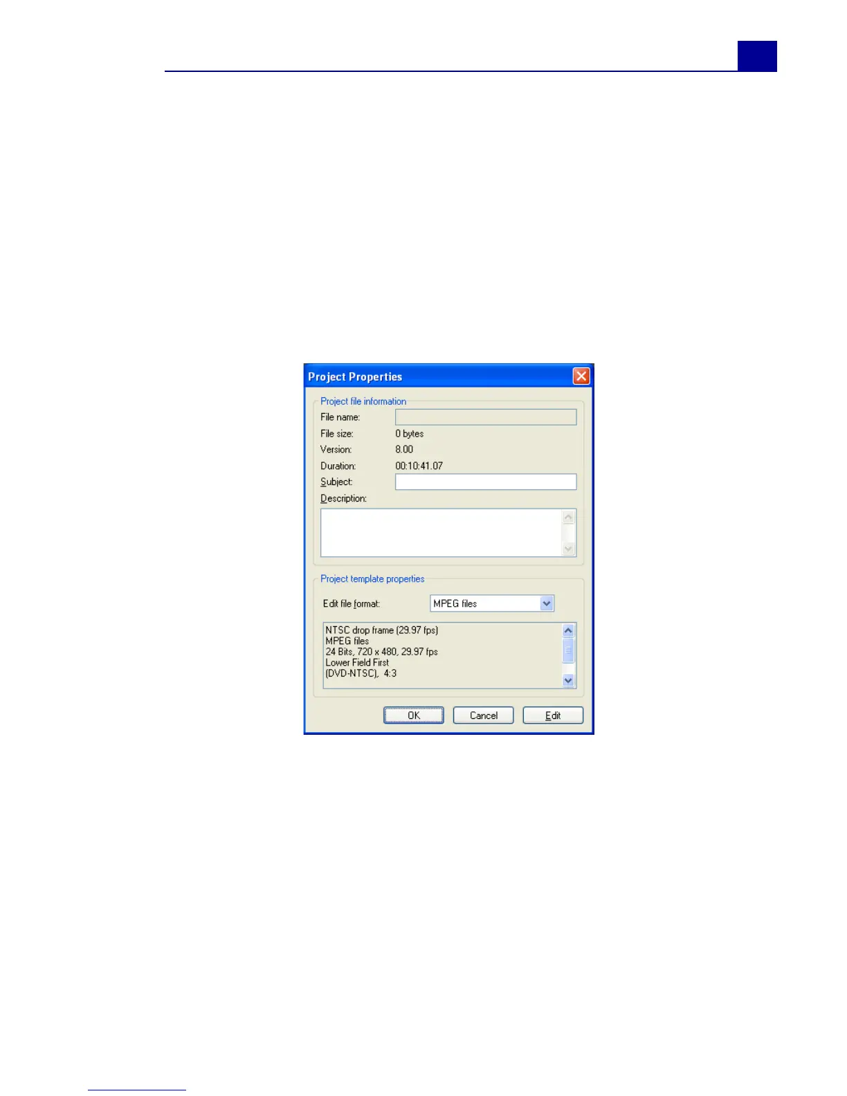 the project file such as file size and duration.