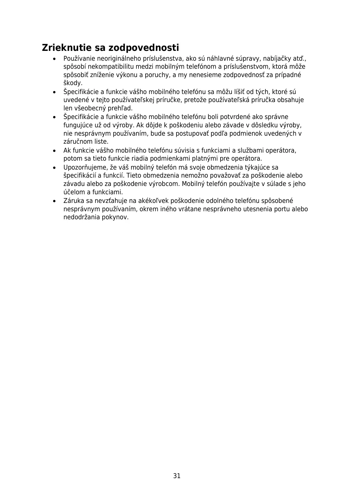 závadu alebo za poškodenie výrobcom. Mobilný telefón používajte v súlade s jeho