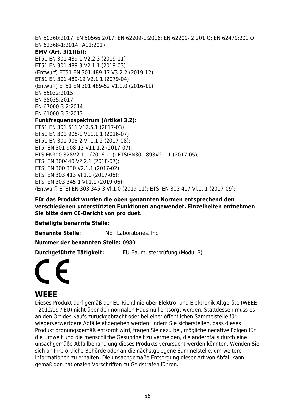 EN 50360:2017; EN 50566:2017; EN 62209-1:2016; EN 62209- 2:201 O; EN 62479:201 O