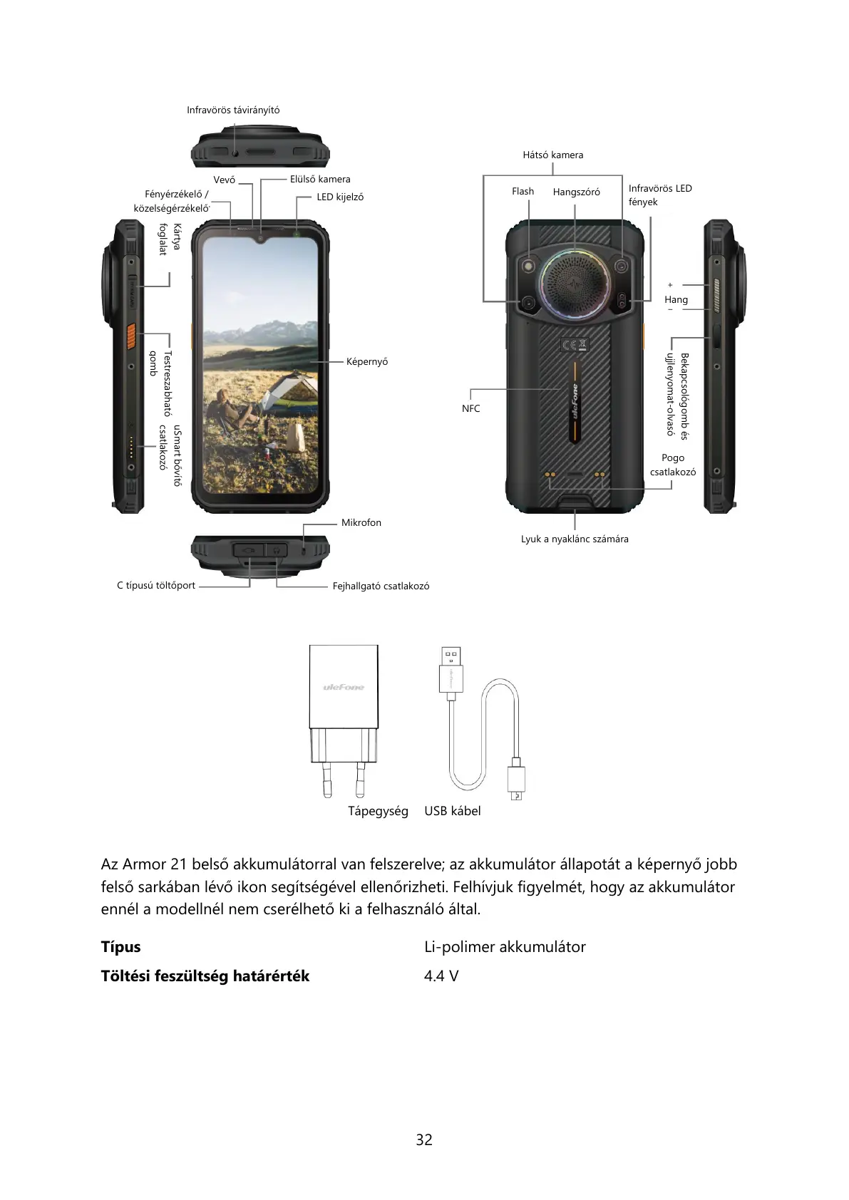Az Armor 21 belakkumulátorral van felszerelve; az akkumulátor állapotát a képernyő jobb