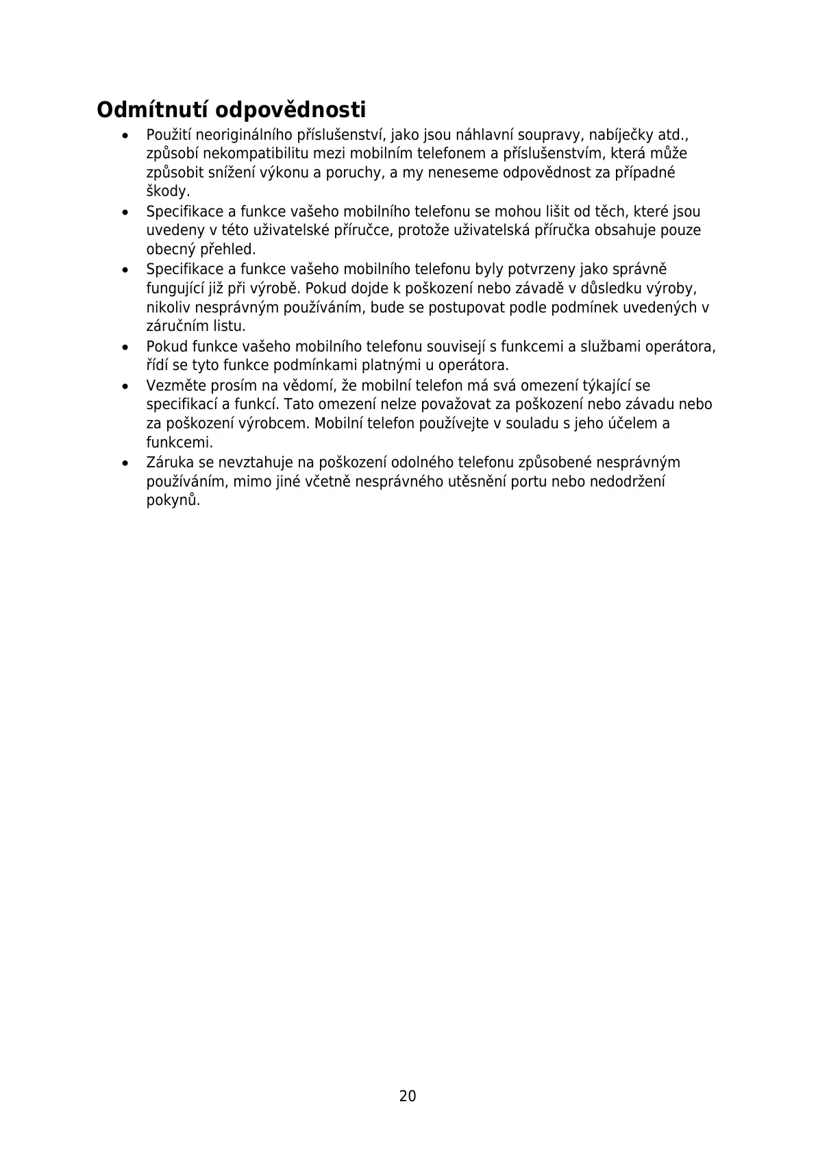 za poškození výrobcem. Mobilní telefon používejte v souladu s jeho účelem a