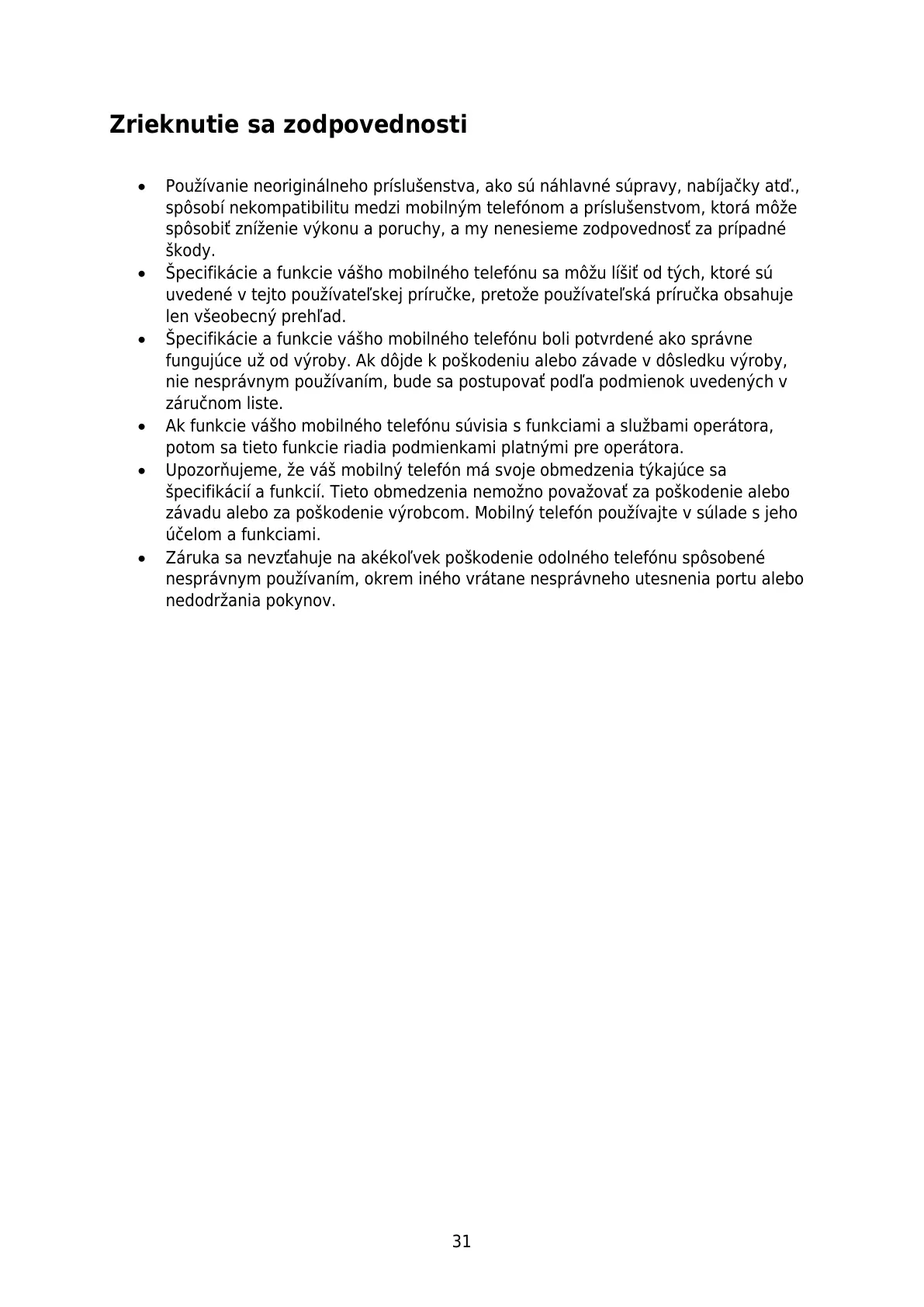 závadu alebo za poškodenie výrobcom. Mobilný telefón používajte v súlade s jeho