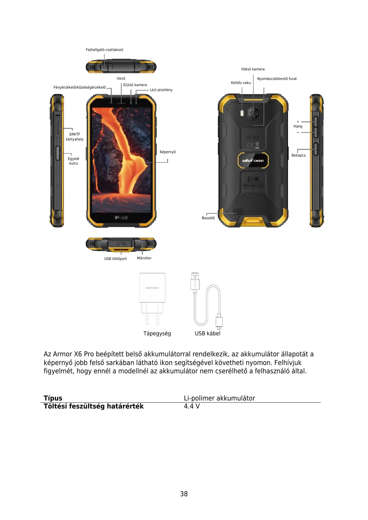 Az Armor X6 Pro beépített belső akkumutorral rendelkezik, az akkumulátor állapotát a