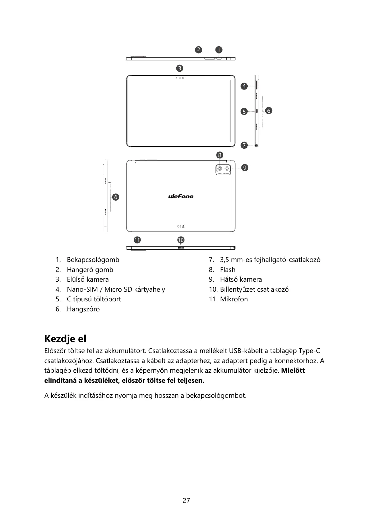 Először töltse fel az akkumulátort. Csatlakoztassa a mellékelt USB-kábelt a táblagép Type-C