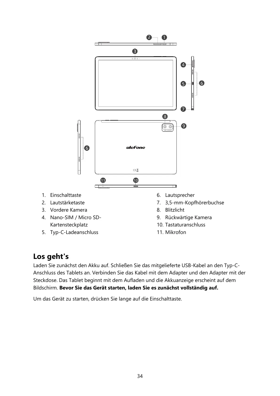 Bildschirm. Bevor Sie das Gerät starten, laden Sie es zunächst vollständig auf.