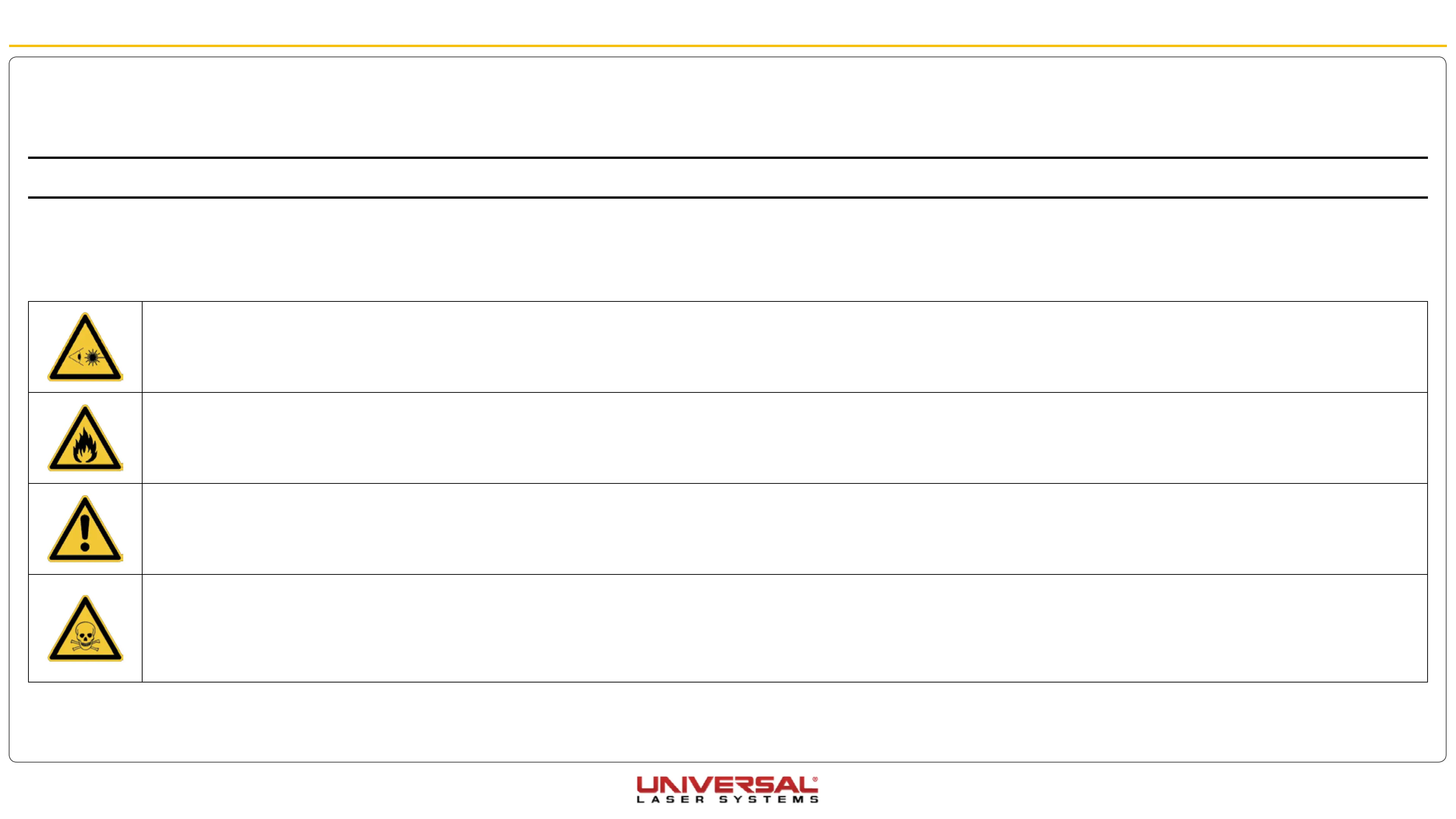 SOME MATERIALS, WHEN ENGRAVED, MARKED OR CUT WITH A LASER, CAN PRODUCE TOXIC AND CORROSIVE FUMES. Obtain the Material Safety Data Sheet (MSDS) from the manufacturer of every