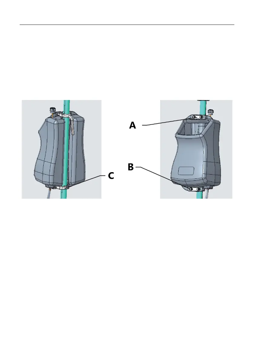 b) Use two clamps to attach the tank to the tube of the control handle. Then