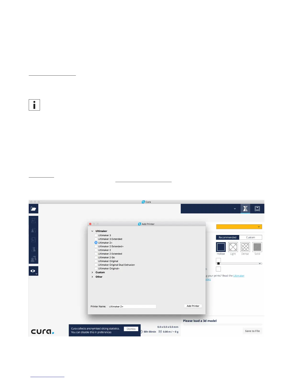 select your 3D printer, the Ultimaker 2+. No other configuration is required and you can directly start using Ultimaker Cura.