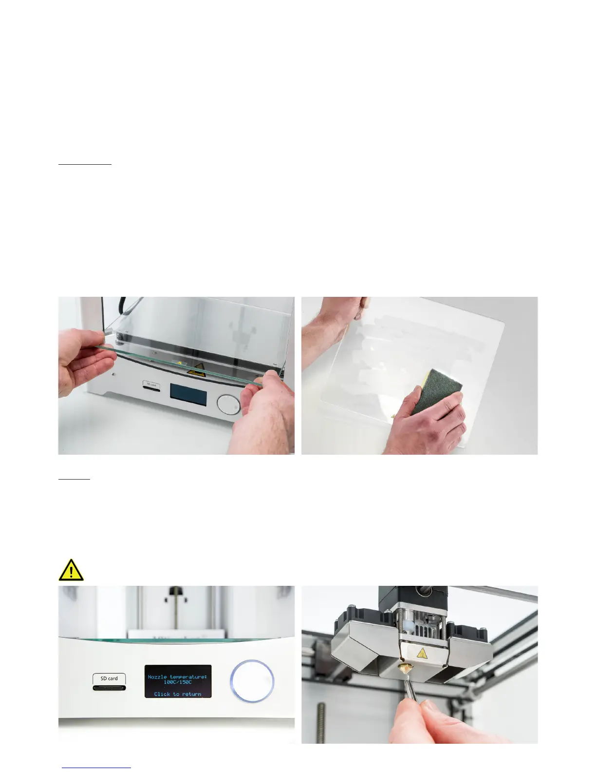 1. Navigate to Maintenance g Advanced g Heatup nozzle and rotate the button to set the temperature to 150 °C.