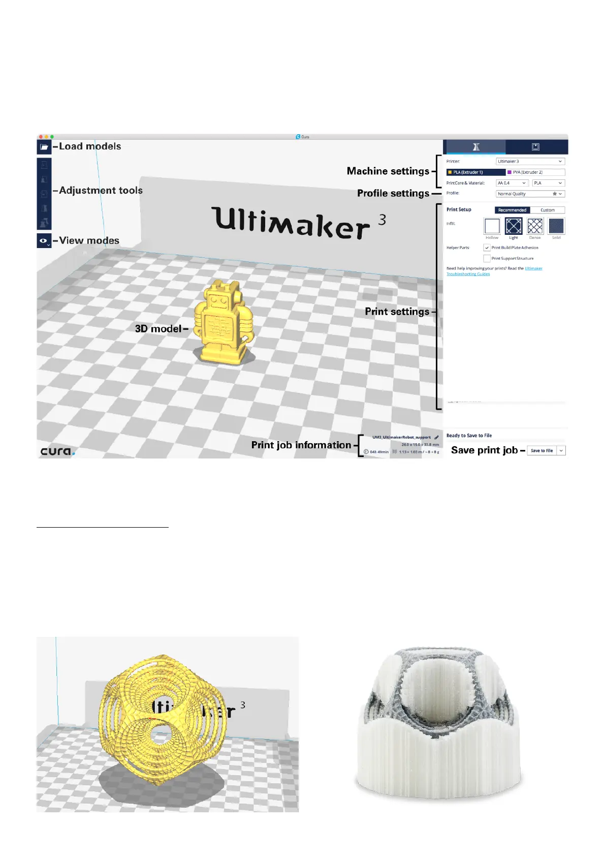 After you have added the Ultimaker 3 in Cura, the main interface will become visible. Here is an overview of the interface.