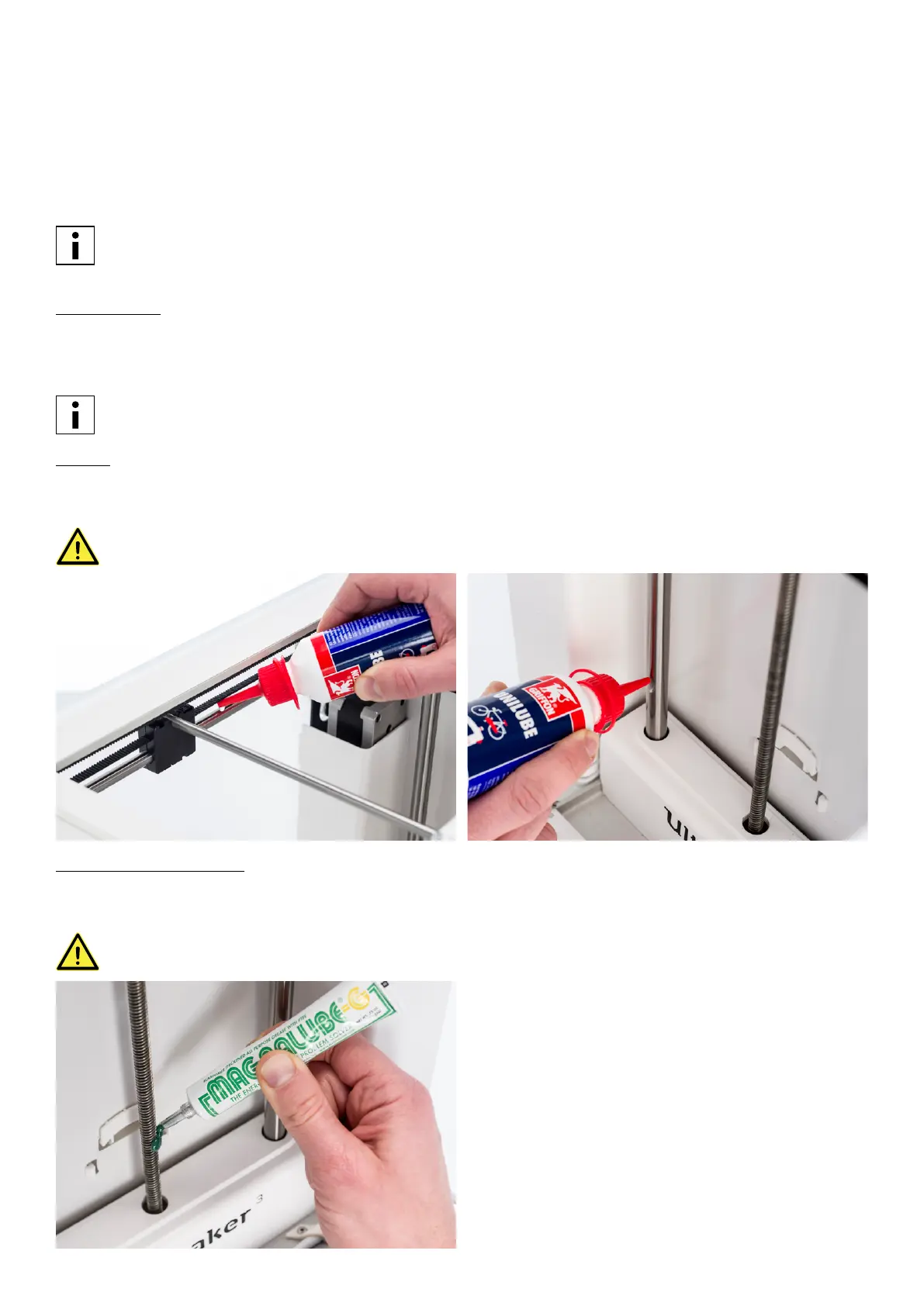 accessory box of your Ultimaker 3 you can find Unilube for the X and Y axles and Magnalube for the Z axle.