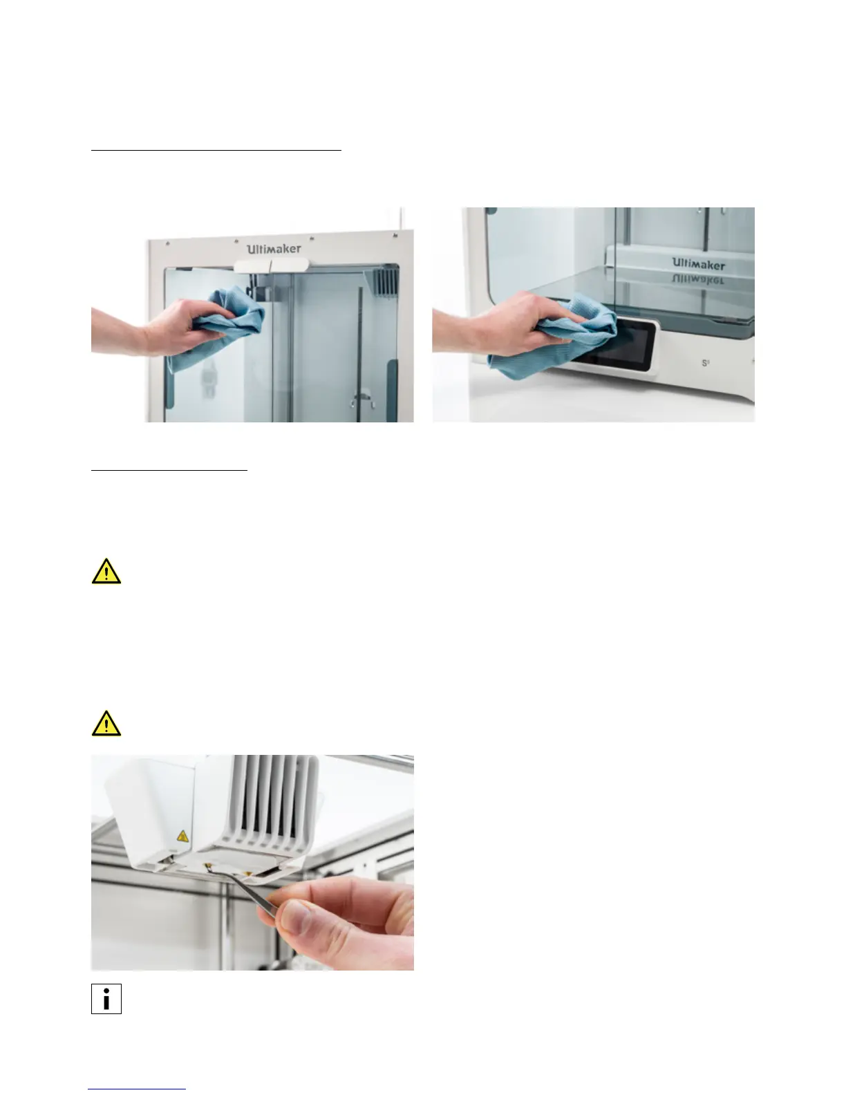 All glass components of the printer (the glass doors and touchscreen) should be cleaned regularly to remove dust or