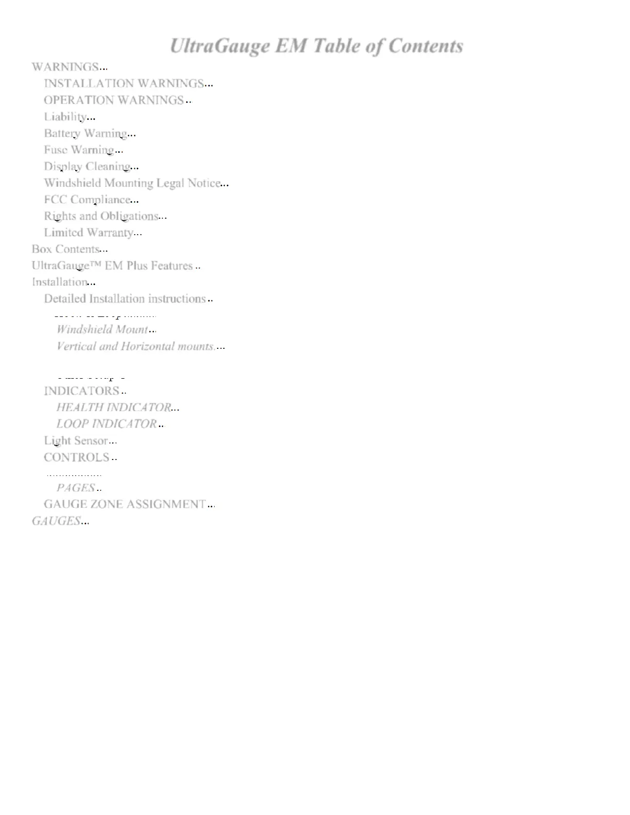 UltraGauge EM Table of Contents