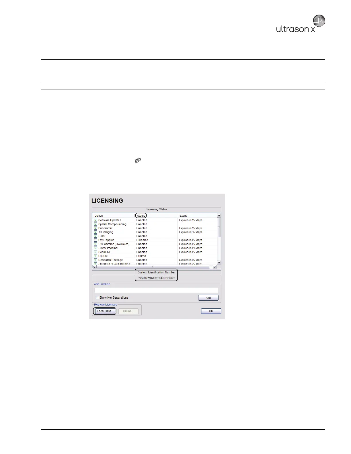 3. Make note of the System Identification Number shown in the Licensing window and forward it to Ultrasonix