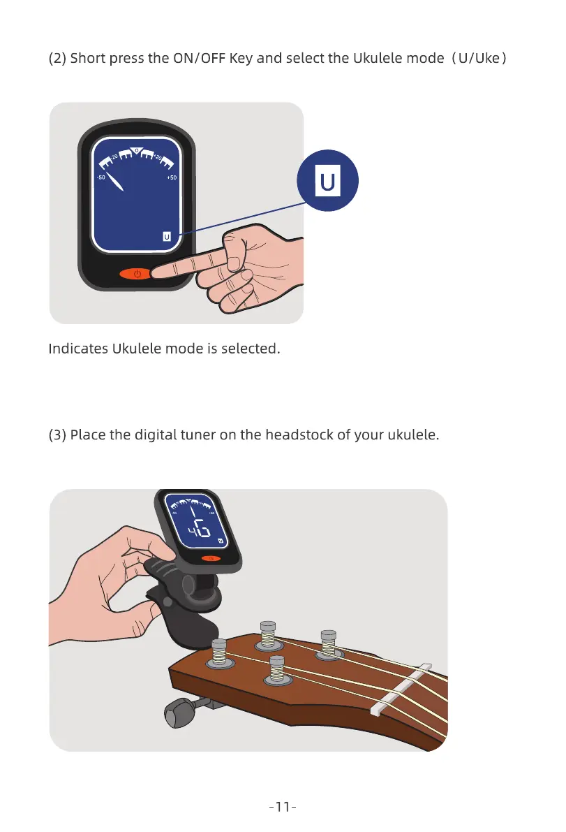 (2) Short press the ON/OFF Key and select the Ukulele mode (U/Uke)