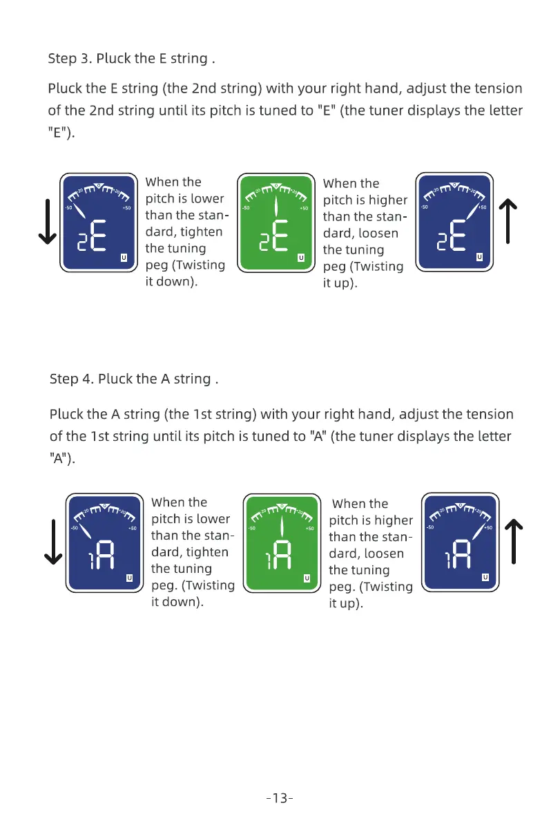 of the 2nd string until its pitch is tuned to "E" (the tuner displays the letter