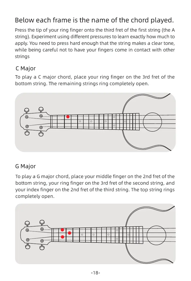 To play a G major chord, place your middle finger on the 2nd fret of the