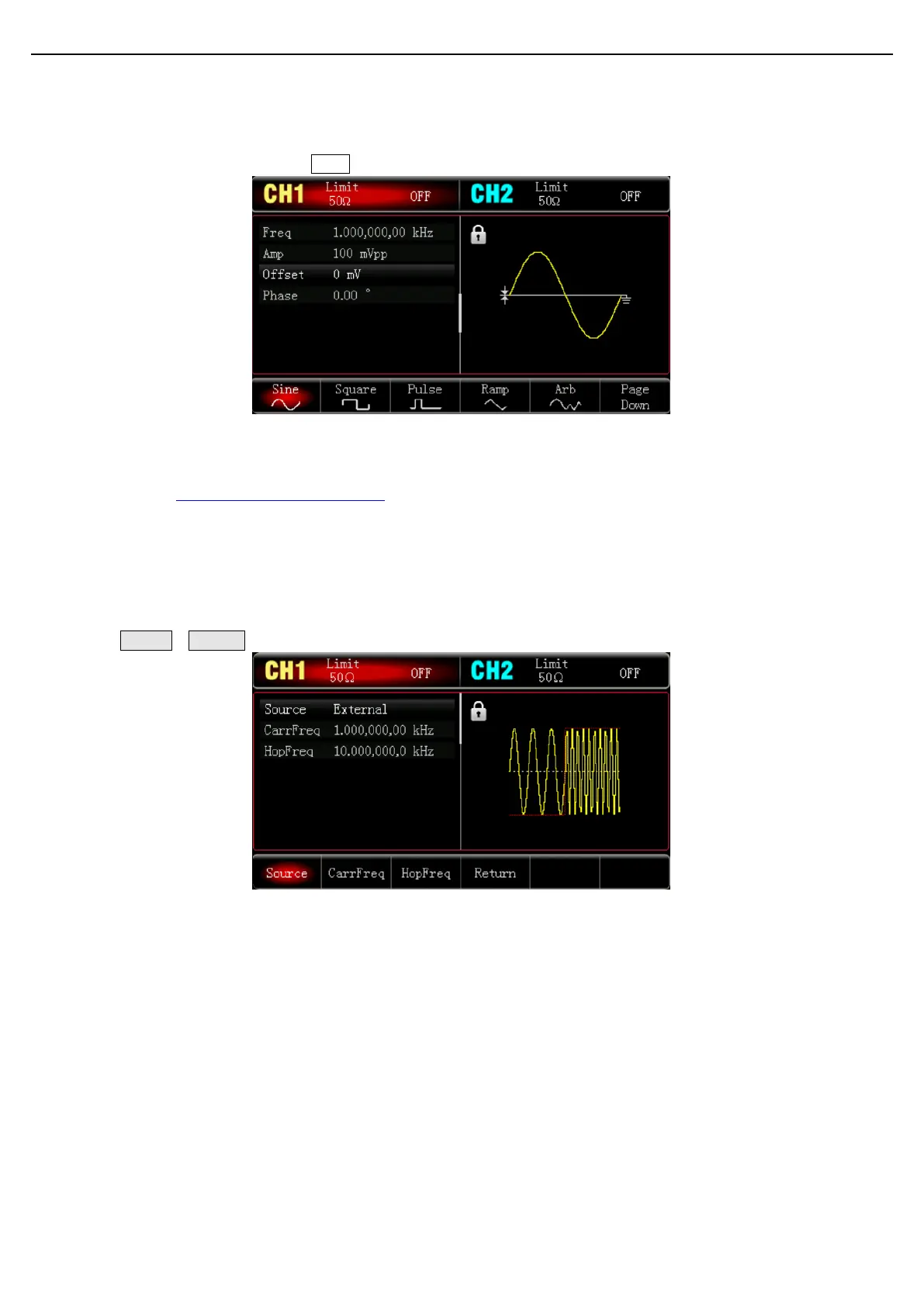 The carrier wave can be sine wave, square wave, ramp wave or arbitrary wave. The default is sine wave. After