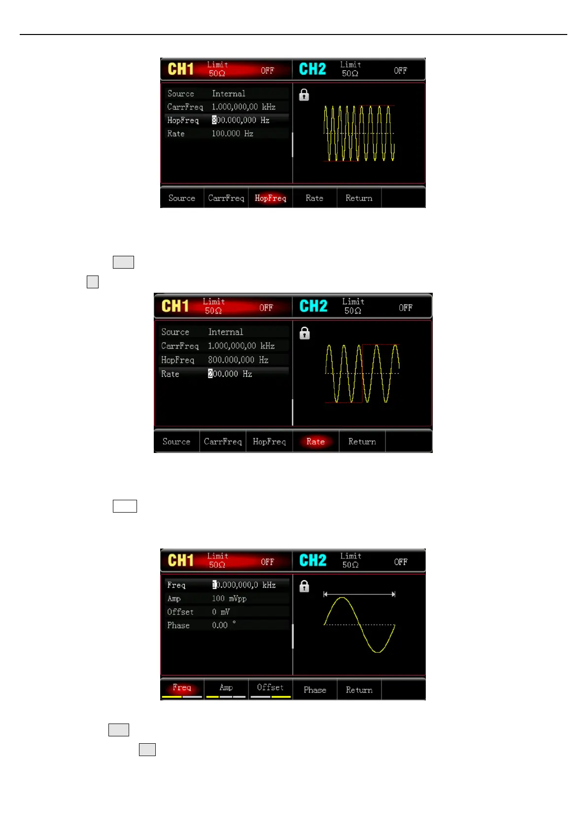 Press Wave key to enter the carrier wave interface and select sine wave to be the carrier wave (the default