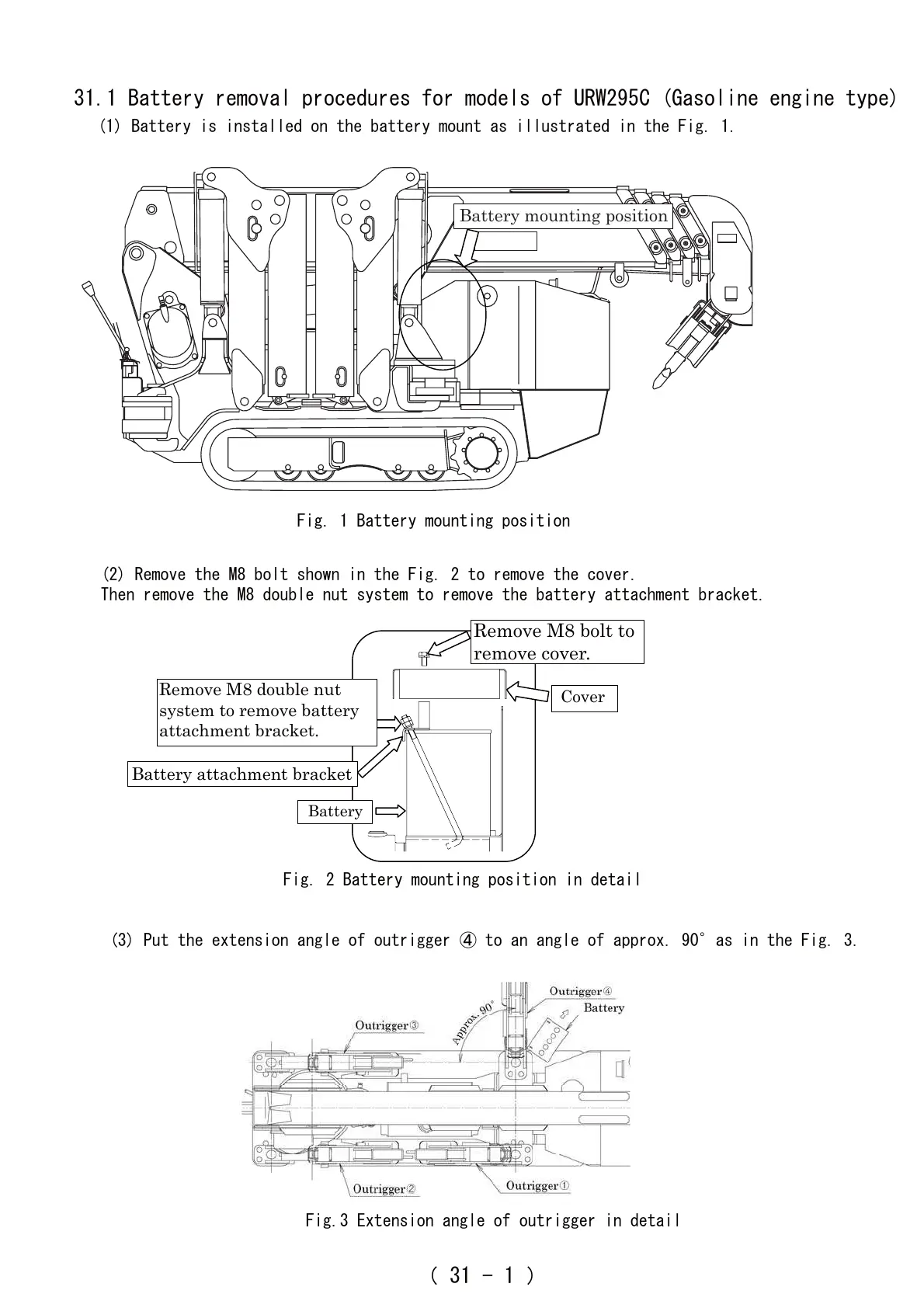 31.1 Battery removal procedures for models of URW295C (Gasoline engine type)