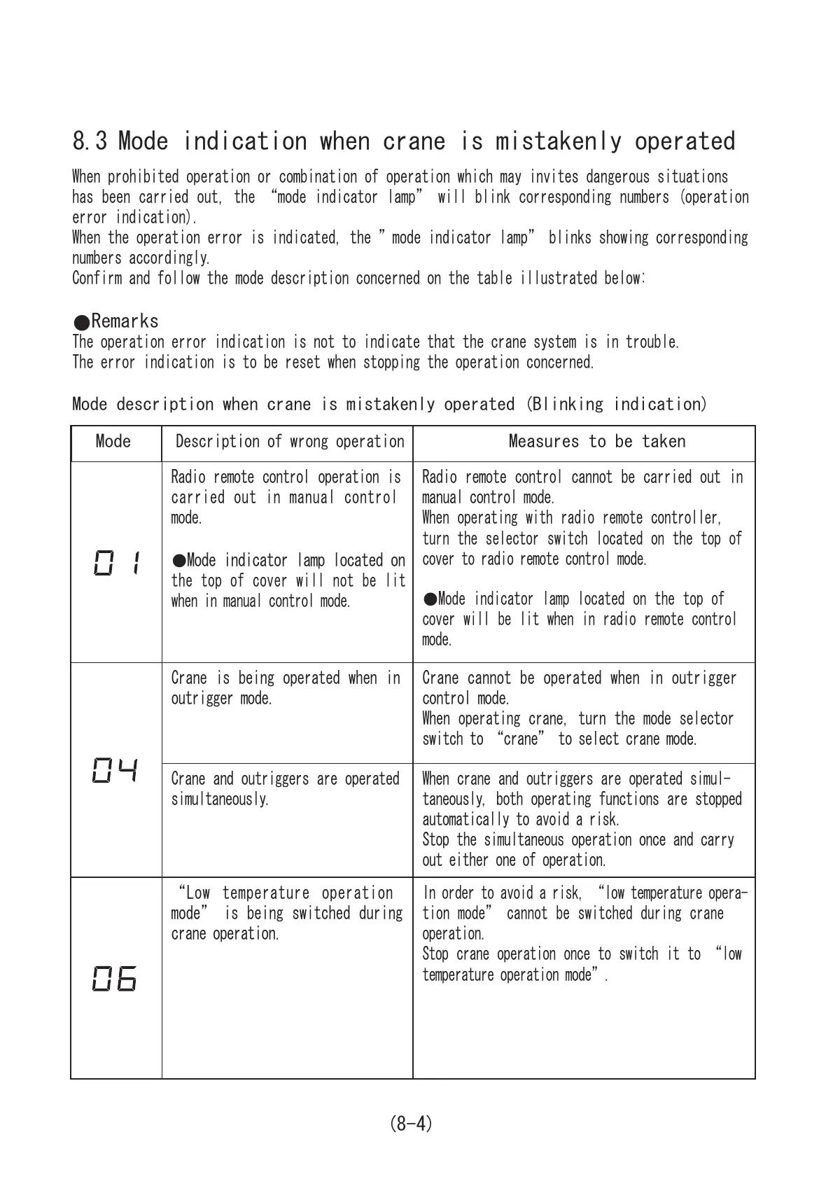 8.3 Mode indication when crane is mistakenly operated