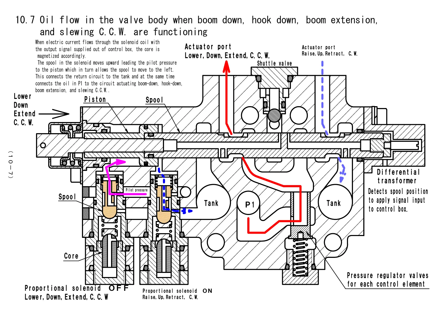 10.7 Oil flow in the valve body when boom down, hook down, boom extension,