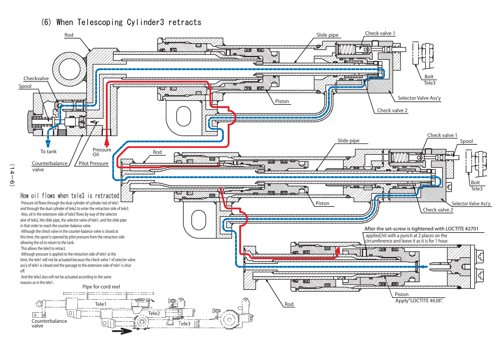 and through the dual cylinder of tele2 to enter the retraction side of tele3.