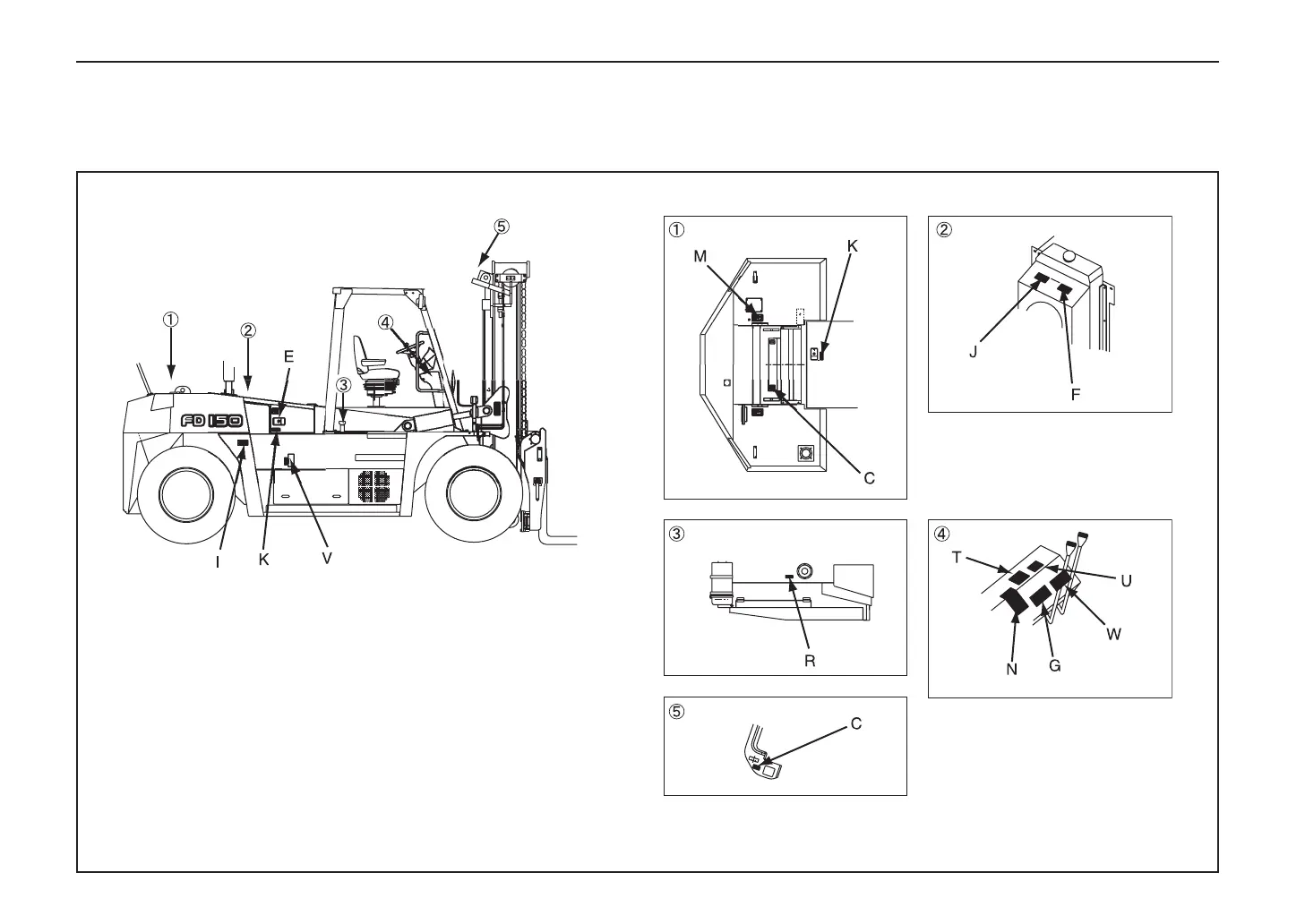 The caution plates attached to the lift truck explain cautions to be taken when using the truck, and procedures for operating the truck.