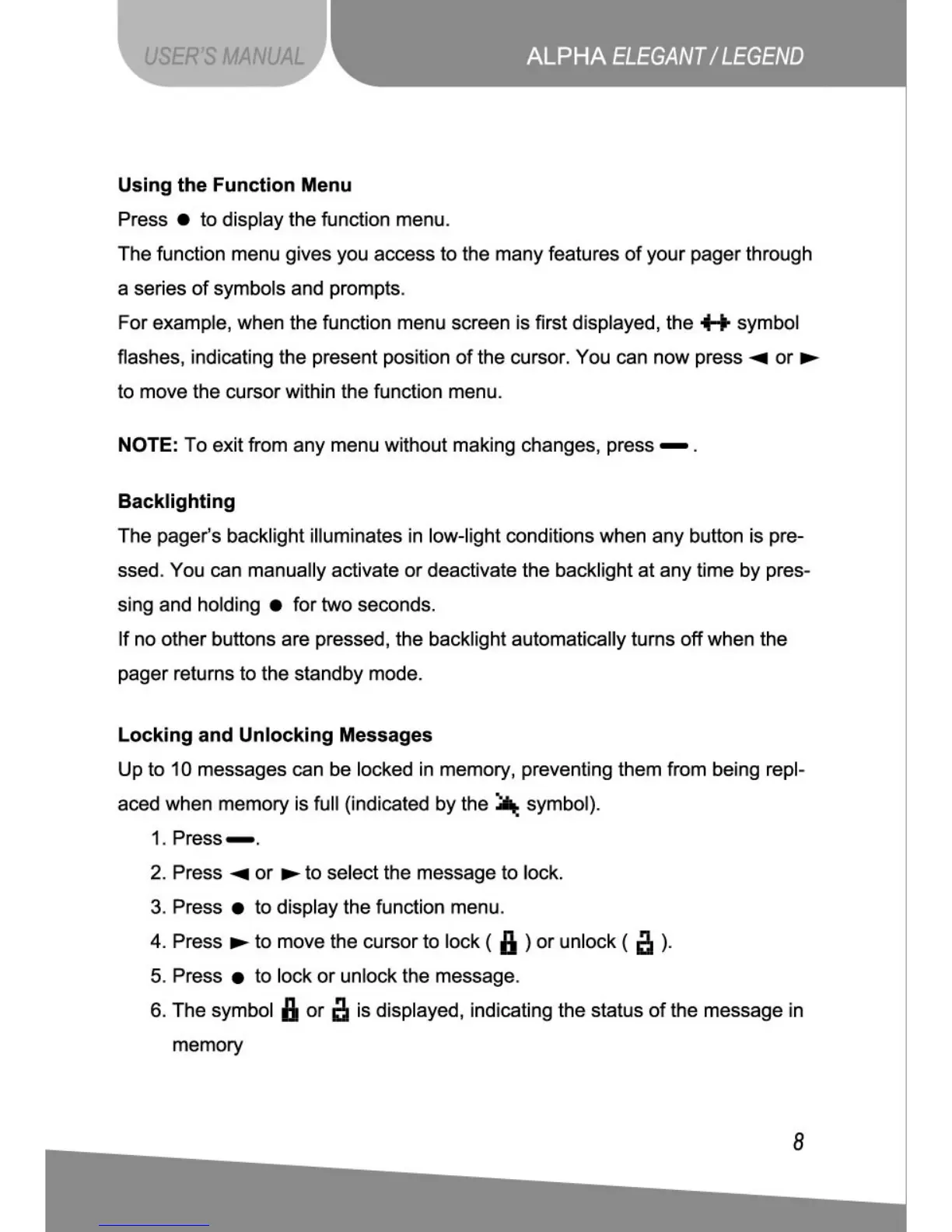 unication Alpha Elegant - Using the Function Menu; Locking and Unlocking Messages