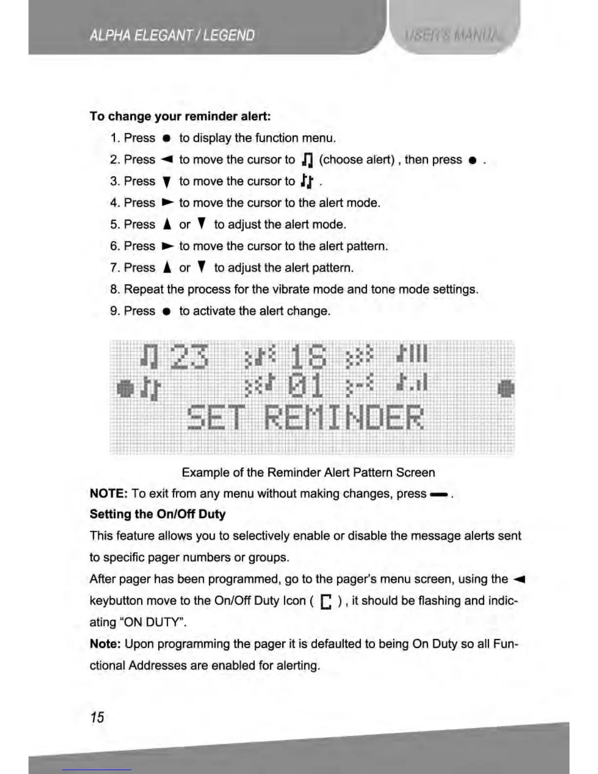unication Alpha Elegant - Change Reminder Alert Pattern; Setting the On;Off Duty