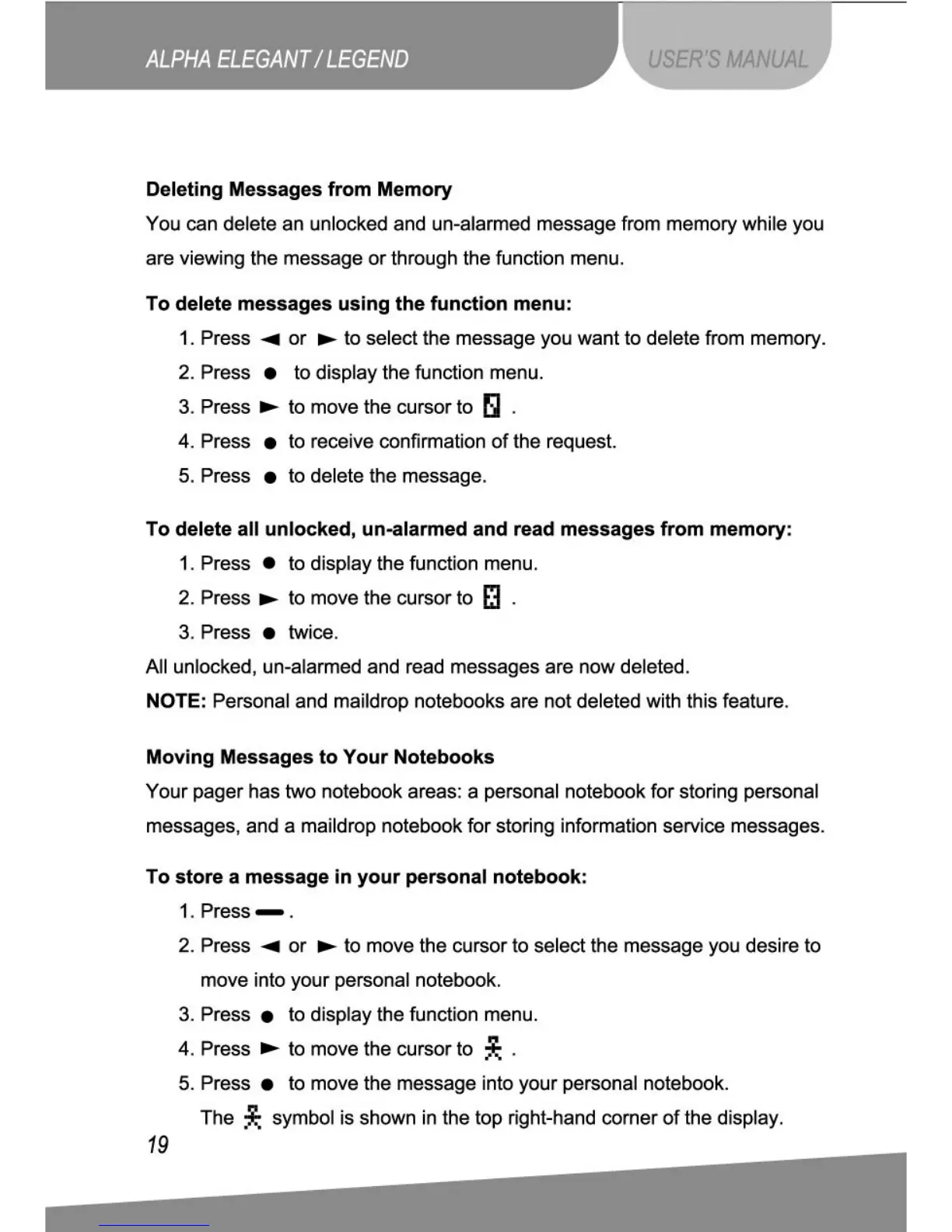 unication Alpha Elegant - Deleting Messages from Memory; To Delete Messages Using the Function Menu; To Delete All Unlocked, Un-alarmed Messages; Moving Messages to Your Notebooks