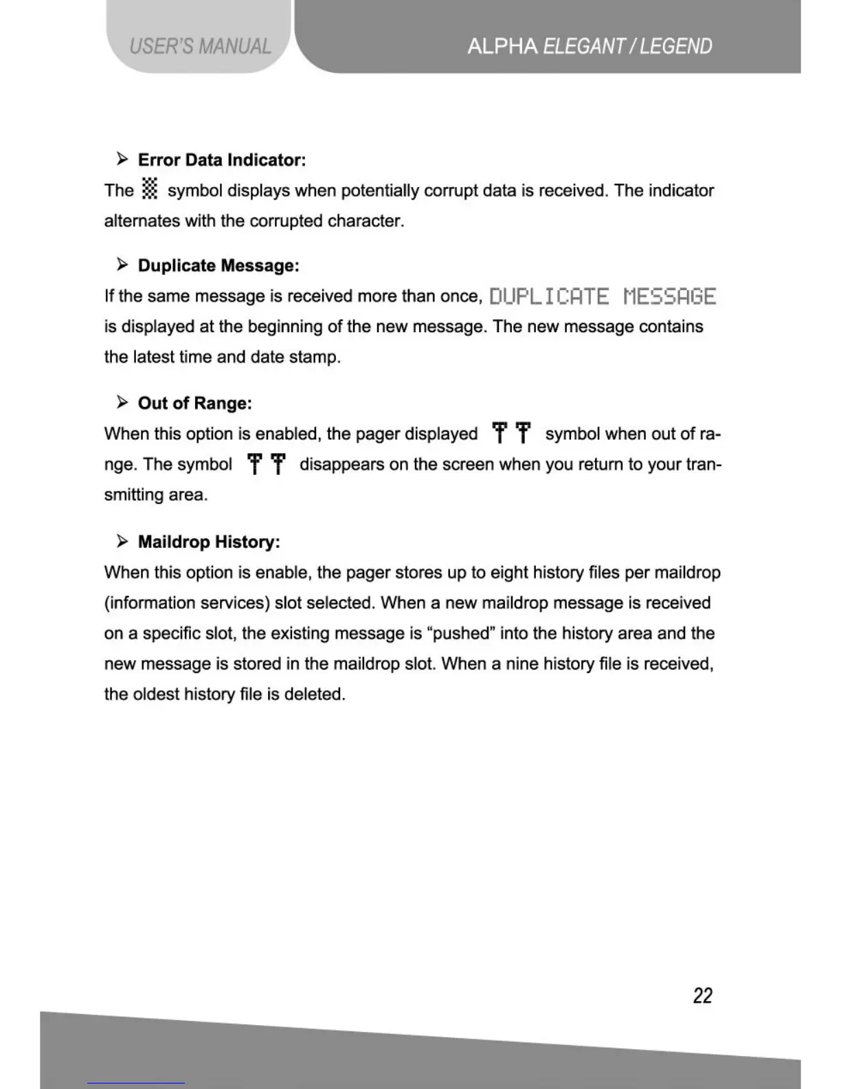 unication Alpha Elegant - Error Data Indicator; Duplicate Message; Out of Range; Maildrop History