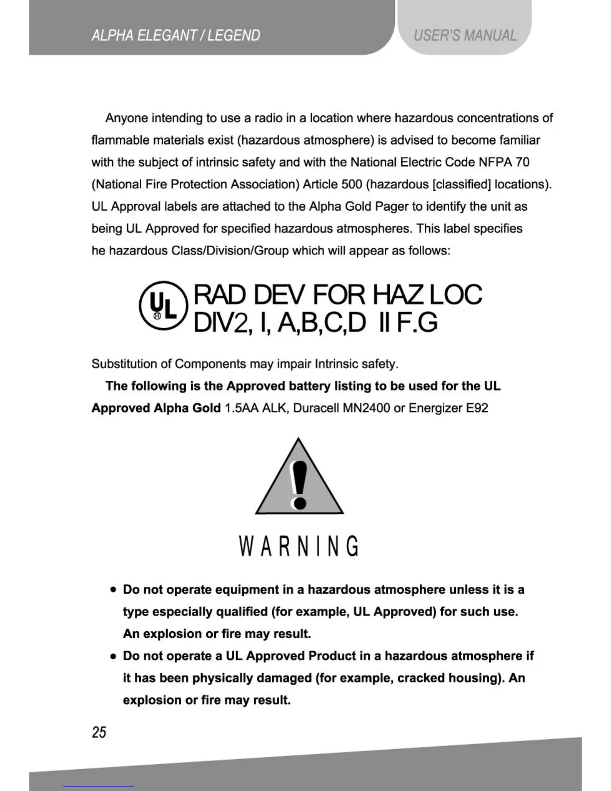 unication Alpha Elegant - Hazardous Location Usage Warnings; UL Approval Information