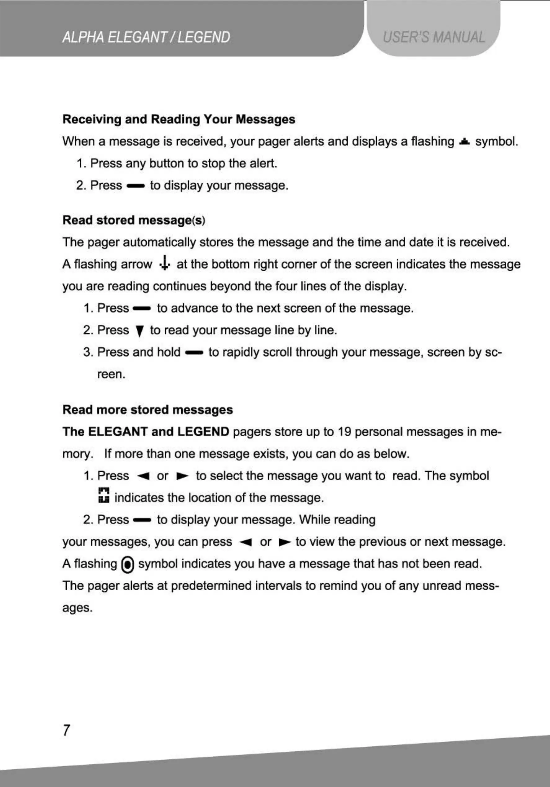 When a message is received, your pager alerts and displays a flashing • symbol.