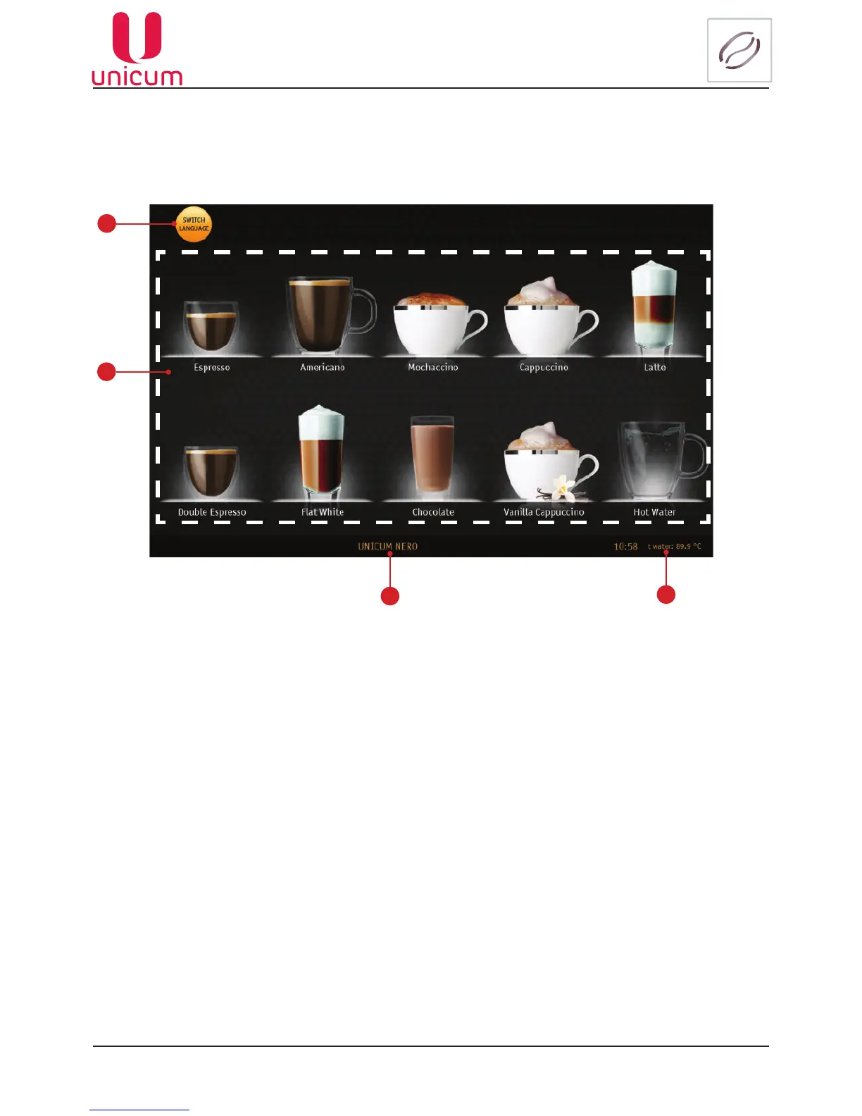 On the initial screen, the various hot drinks are offered for selection. They are shown as images (icons)