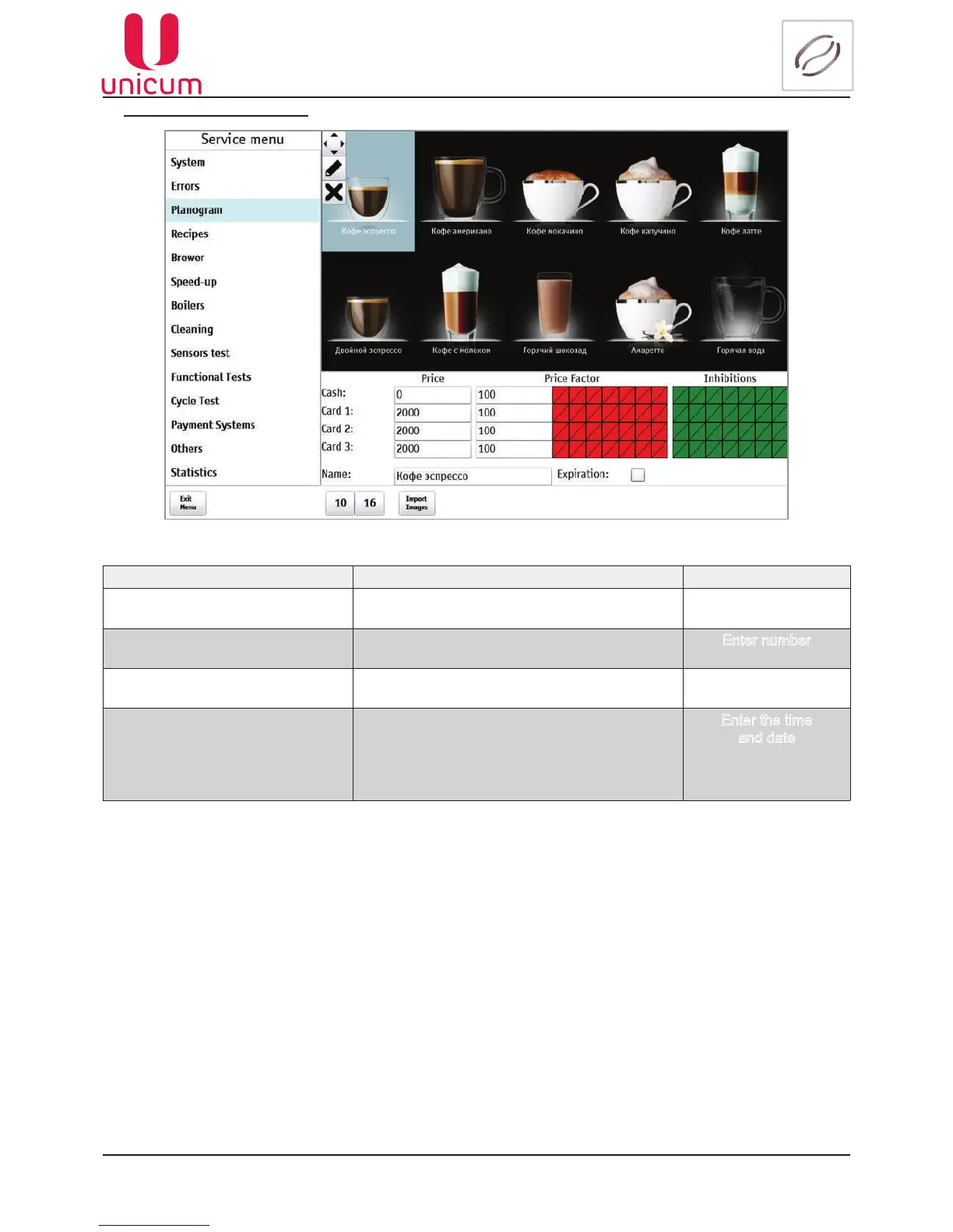 Card 1...3 Setting the cost of a drink when buying a card 1..3 Enter number
