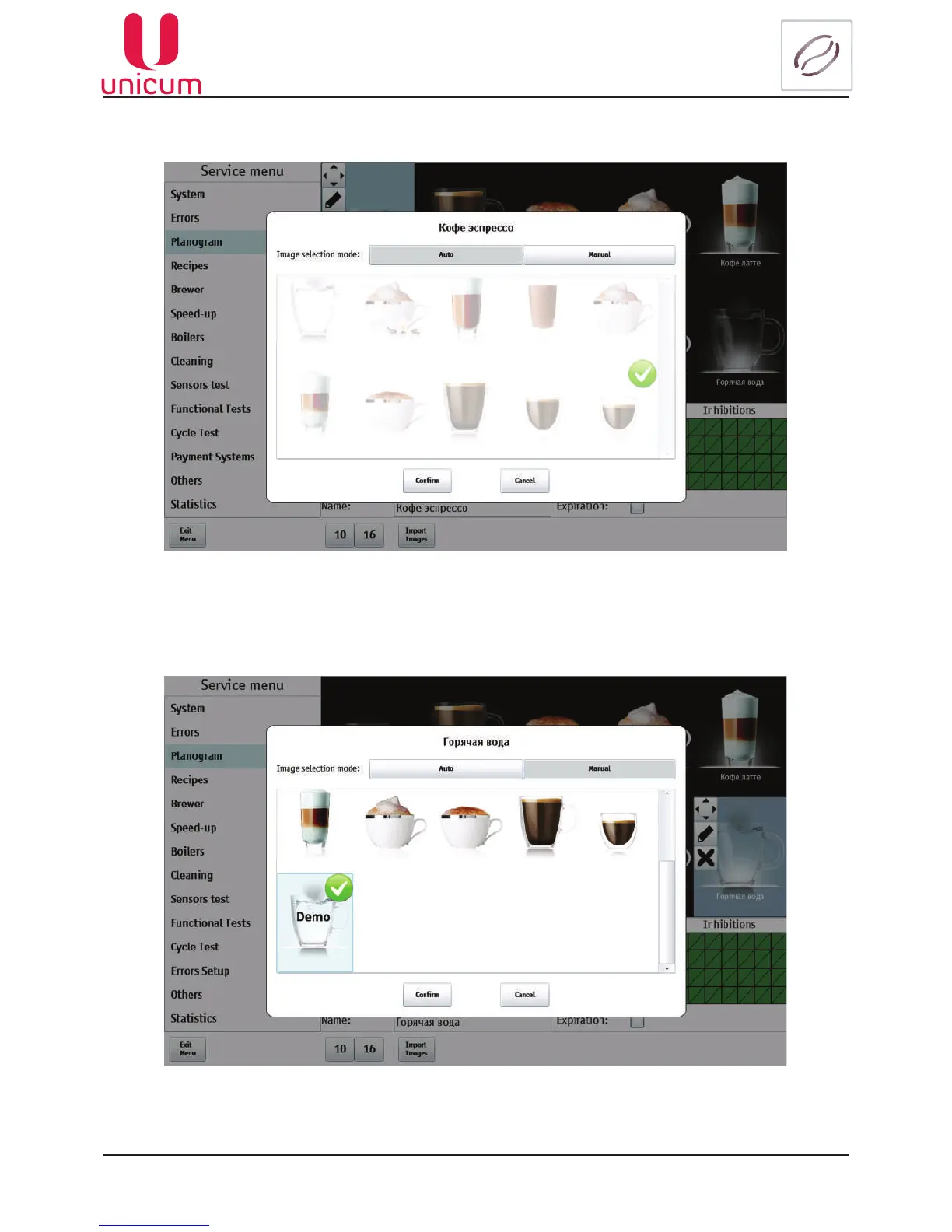5. Now the selected image for the drink will be displayed in the service menu planogram and in the