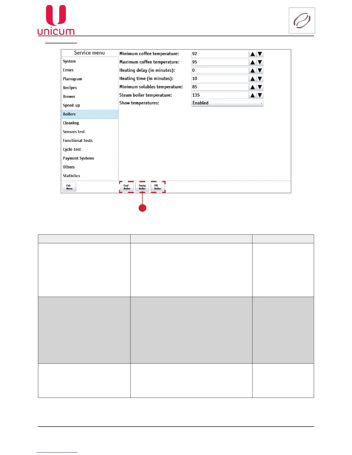Minimum coffee temperature Here the boiler temperature is set. This is the