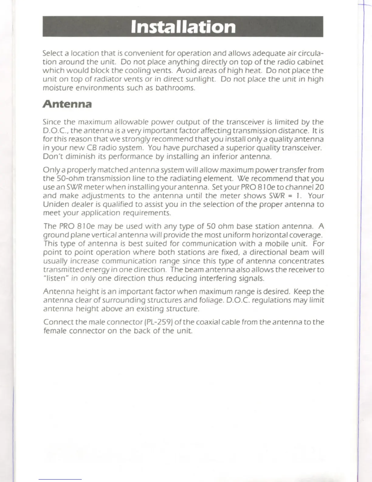use an SWRmeter when installing your antenna. Setyour PRO81Oeto channel 20