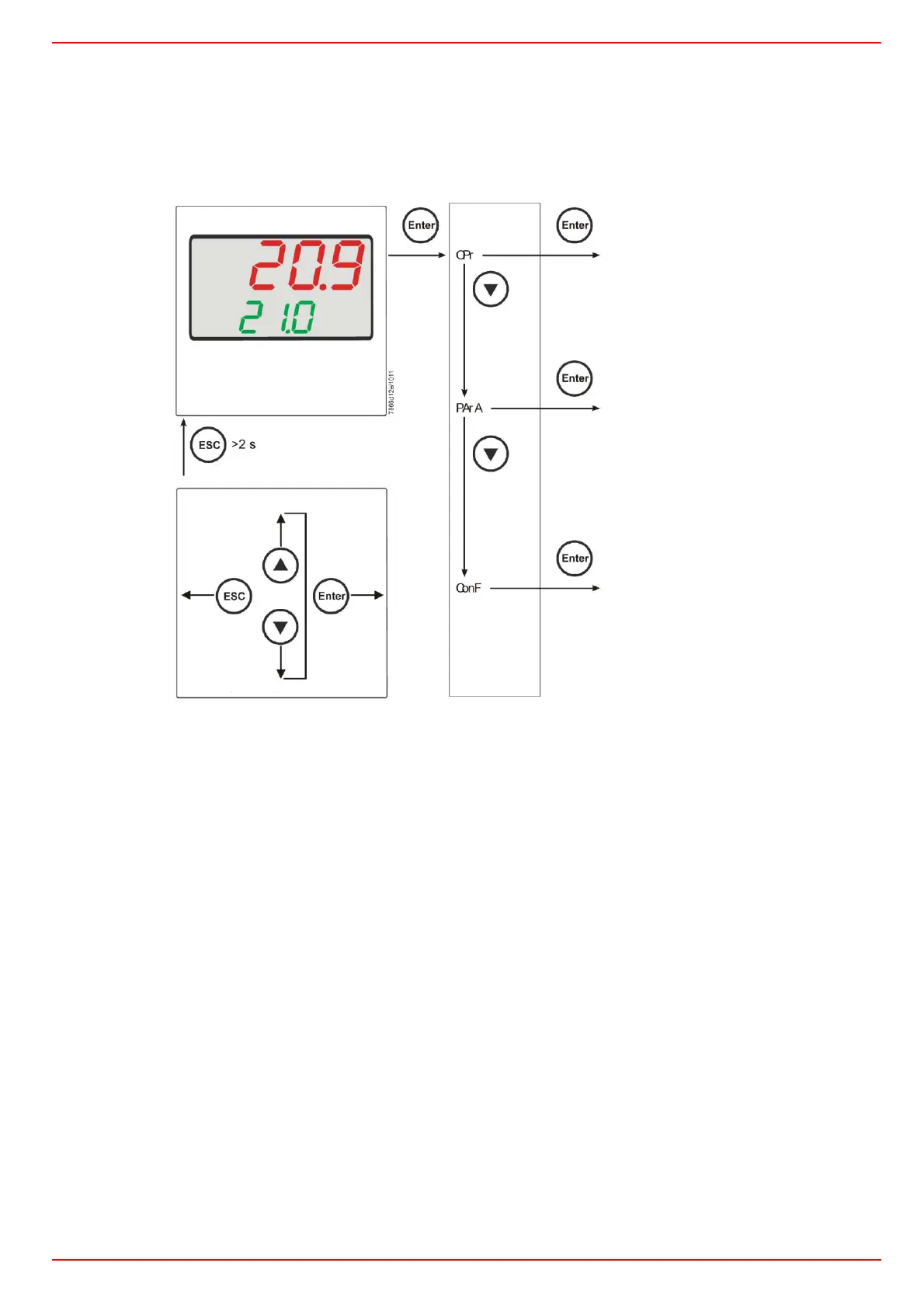 and down arrows change the set-point on the upper display (red).Push Enter to confirm and push ESC more times to get the home position.