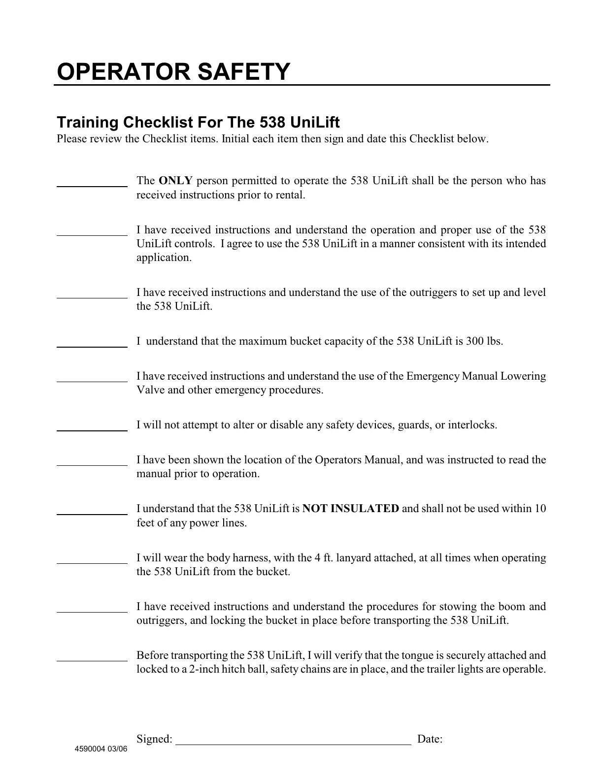 Training Checklist For The 538 UniLift