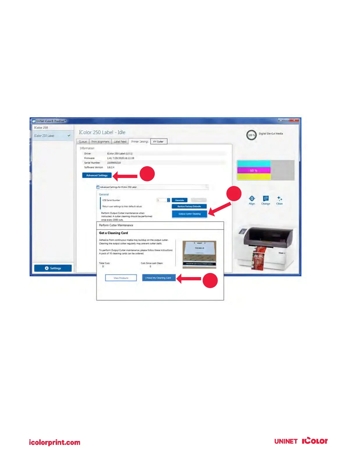 To manually perform a cleaning in UNINET IColor PrintHub, go to the Printer Settings tab – Advanced
