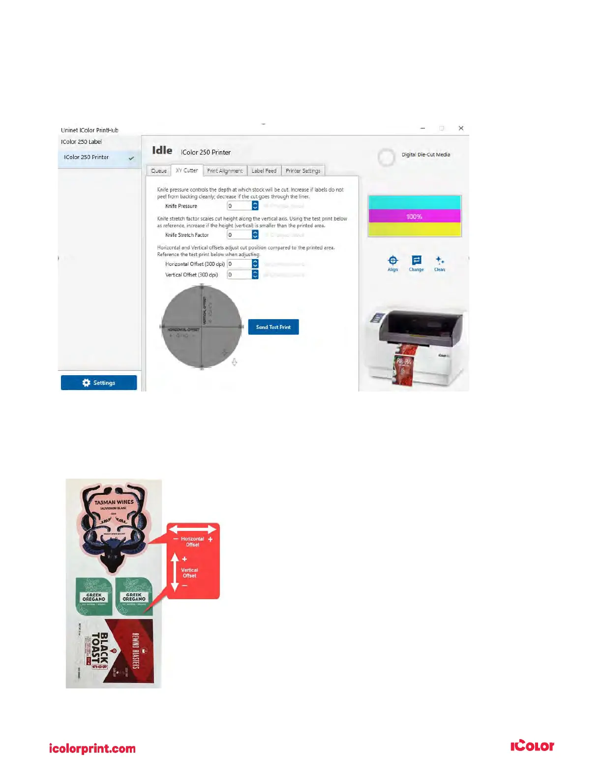 Offset and Vertical Offset settings. Press the Send Test Print to help you determine which direction to