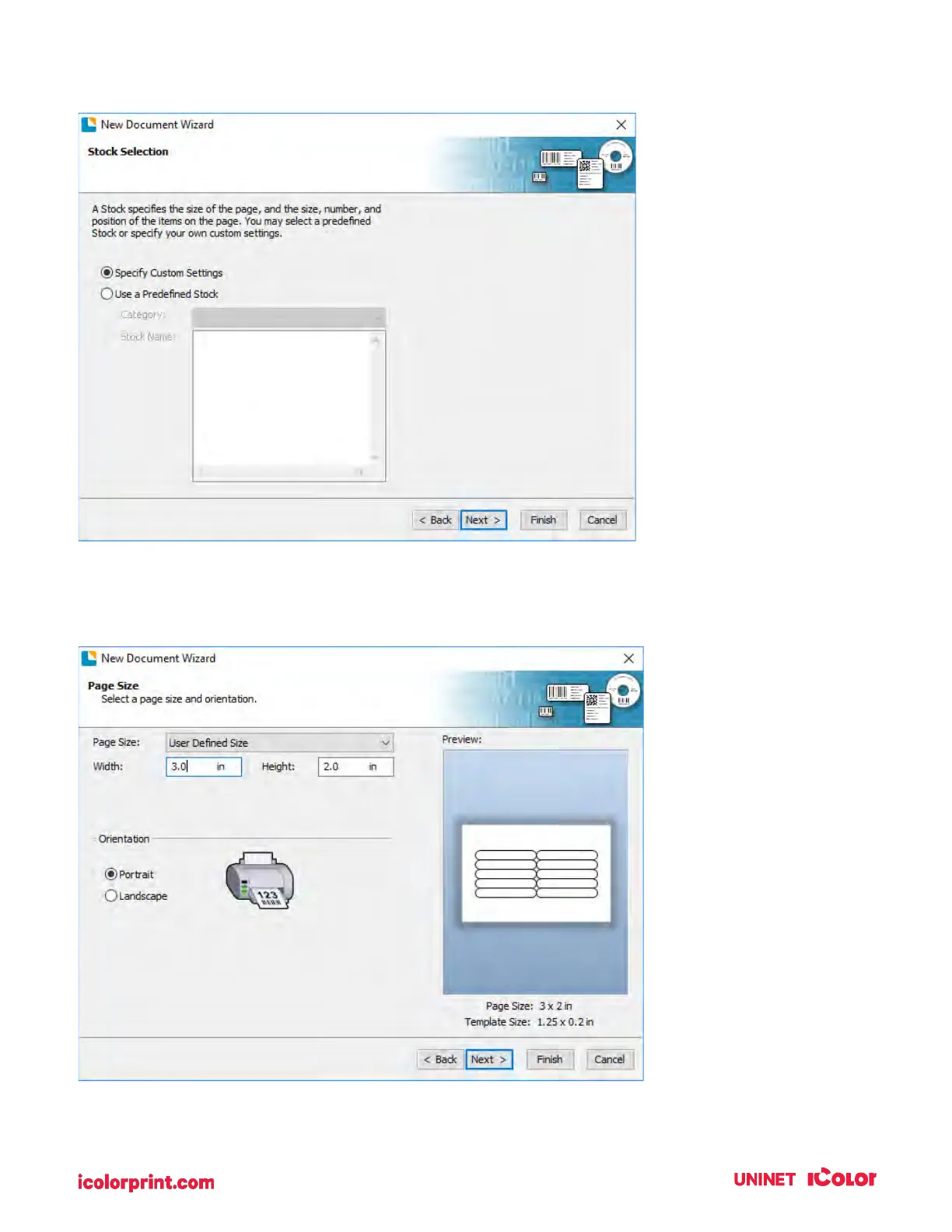 5. Set the page size, width, and height to match labels installed in the printer. Click "Next".