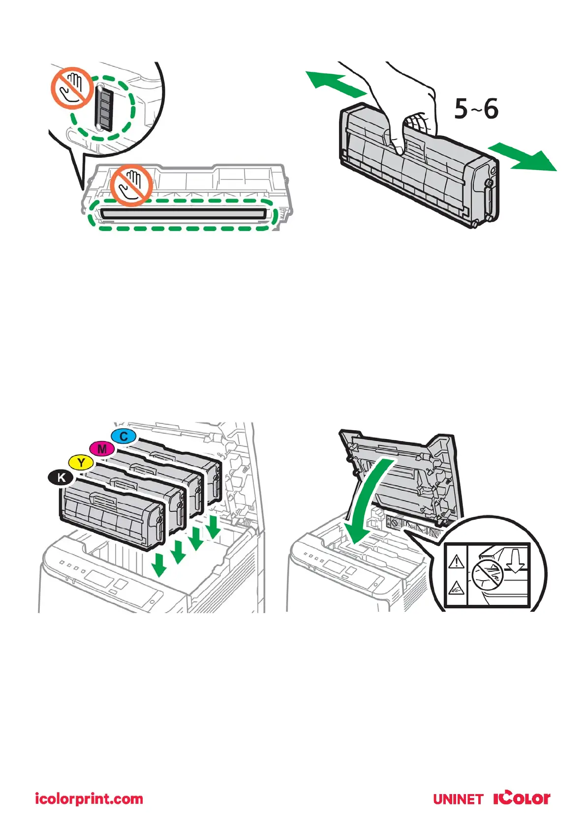 • Remove each cartridge and gently shake back and forth 5 or 6 times to loosen the toner