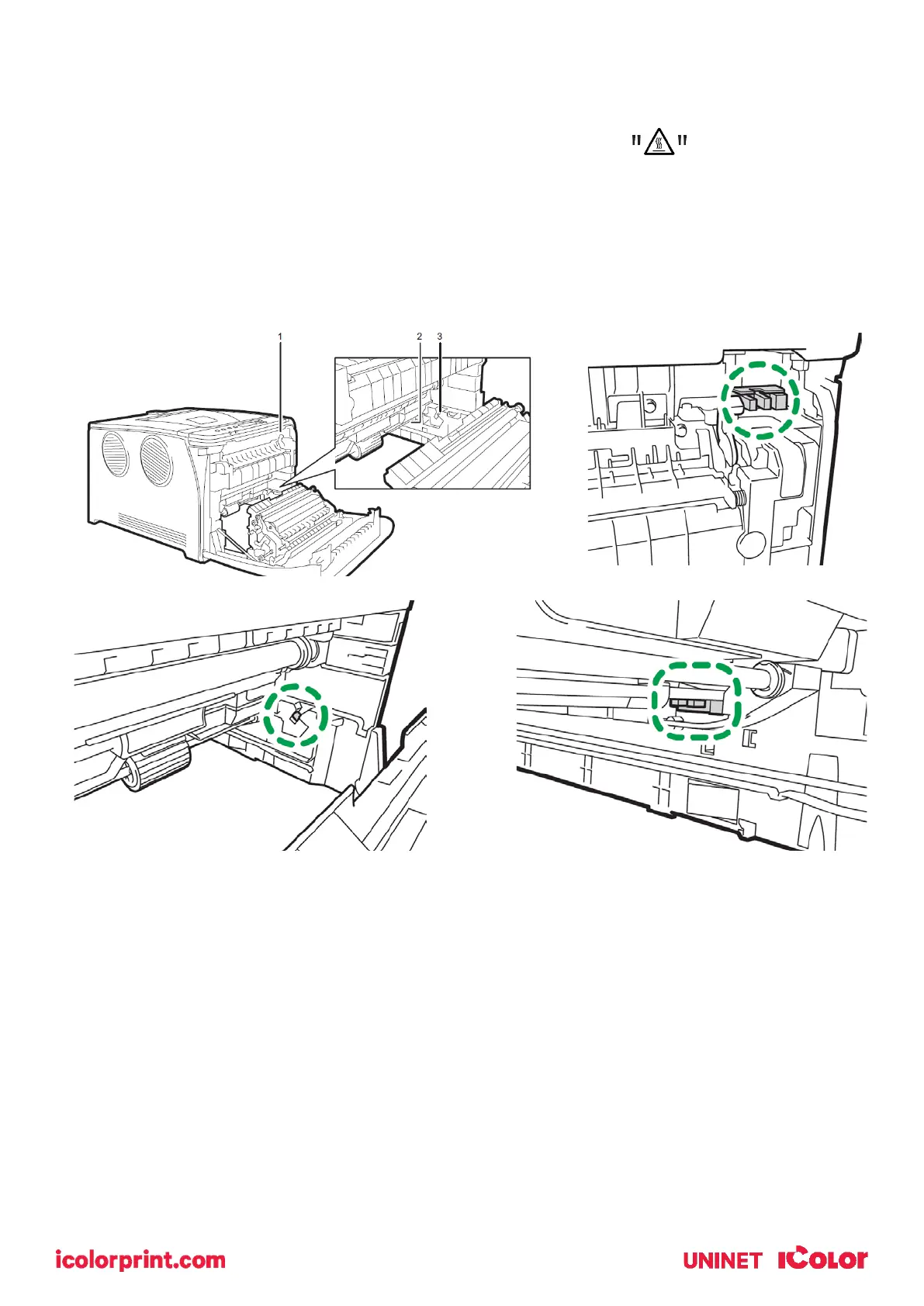 • The inside of this machine becomes very hot. Do not touch the parts labeled (indicating a hot