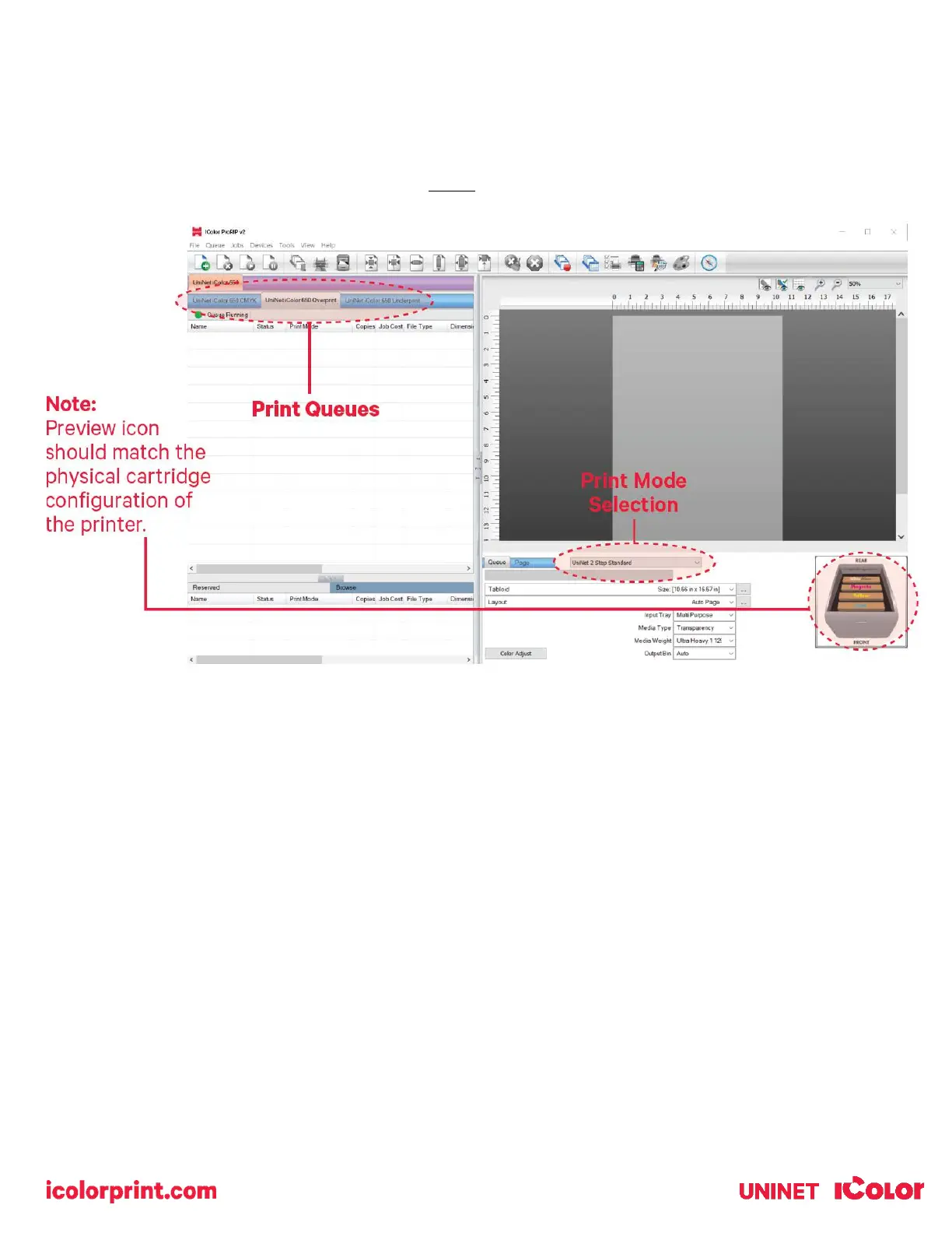 10) In order to print, select the proper Print Queue for your project. Then, select the Print Mode (otherwise known as