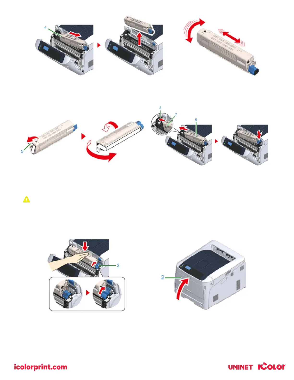 8) Insert a new toner cartridge (6) by aligning its left side indentation (7) with the protrusion (8) on the image drum