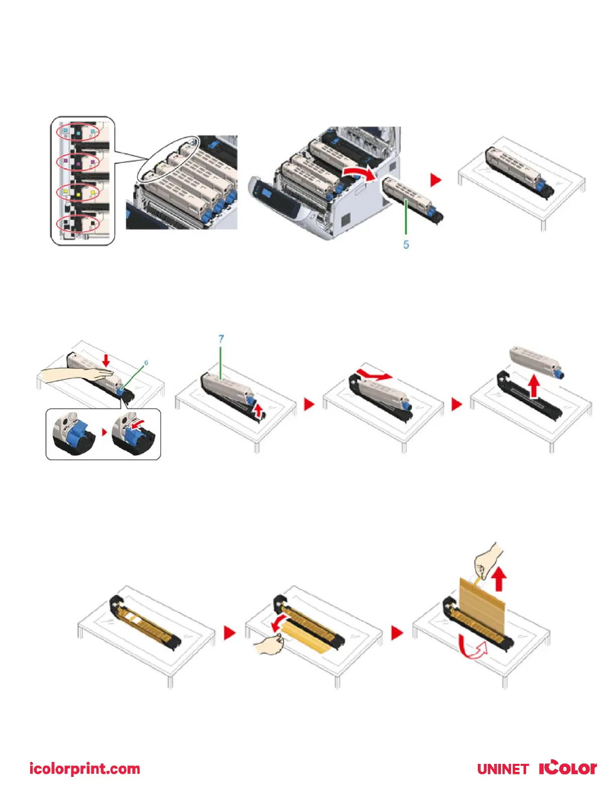 4) Identify the image drum to be replaced by its label color and consulting the ‘Toner / Drum Cartridge Replacement